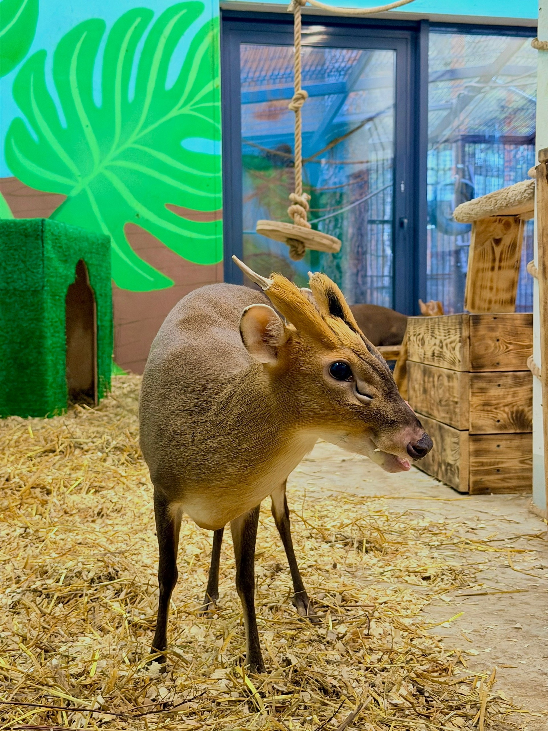Совершенно удивительный саблезубый олень размером с небольшую собаку. Из-за необычного голоса его также называют лающим оленем.