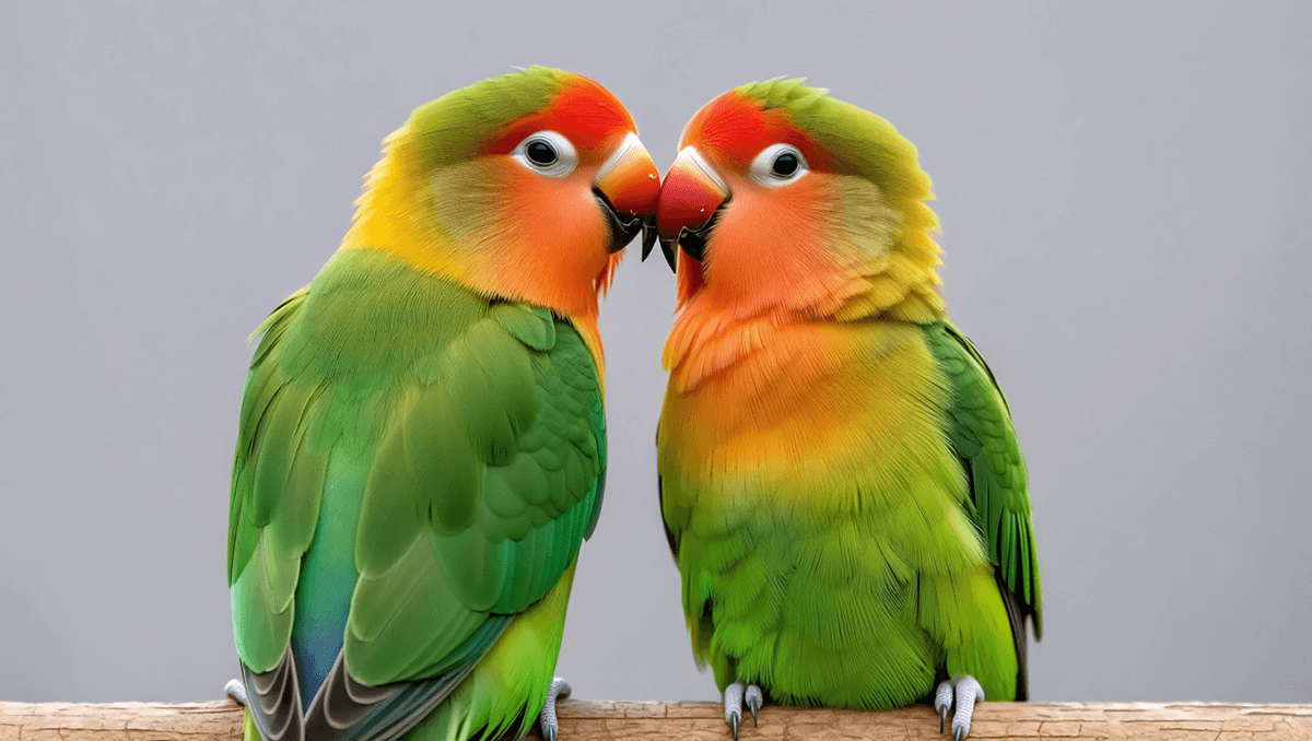 Пара неразлучников нежно перебирает друг другу пёрышки часами. Самки прячут веточки в перьях на спине — встроенный рюкзак для строительства гнезда!