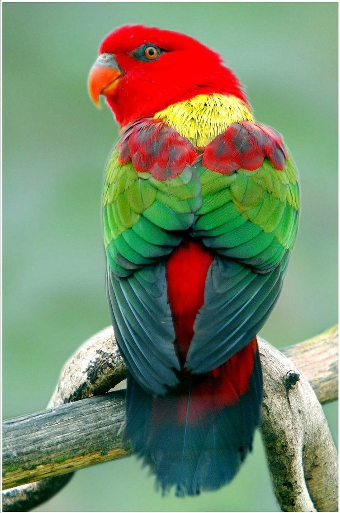 Пылающе-красное оперение делает его одним из самых эффектных лори. Питается нектаром, поэтому помёт жидкий — нюанс для содержания. Очень ласковый и контактный.